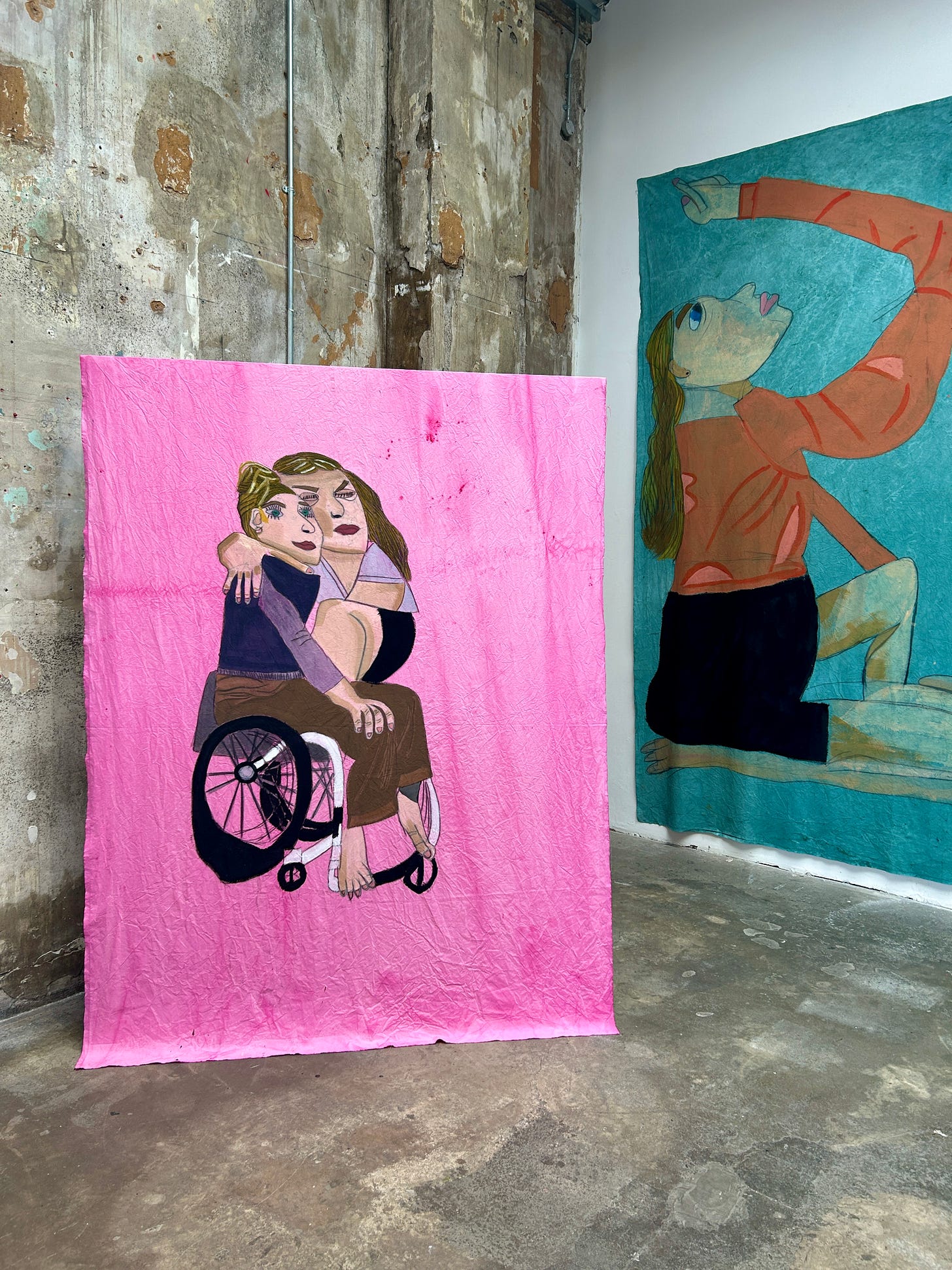 Nancy Clayton’s larger-than-life textile paintings filled the space as you walked in, standing tall and soft even against the huge and industrial Copeland gallery. A grey day in the gallery had the acidy-bright colours that the artists use glowing. Nancy’s pink backdrops were really singing, highlighter colours highlighting a beautiful double portrait.