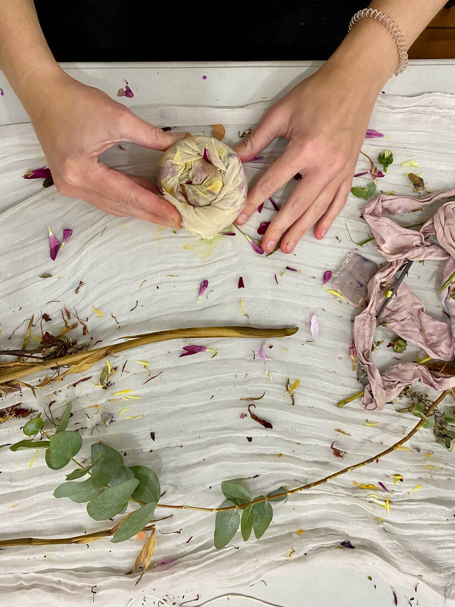 Make these with her using a favourite and very simple natural dye technique, bundle dyeing.