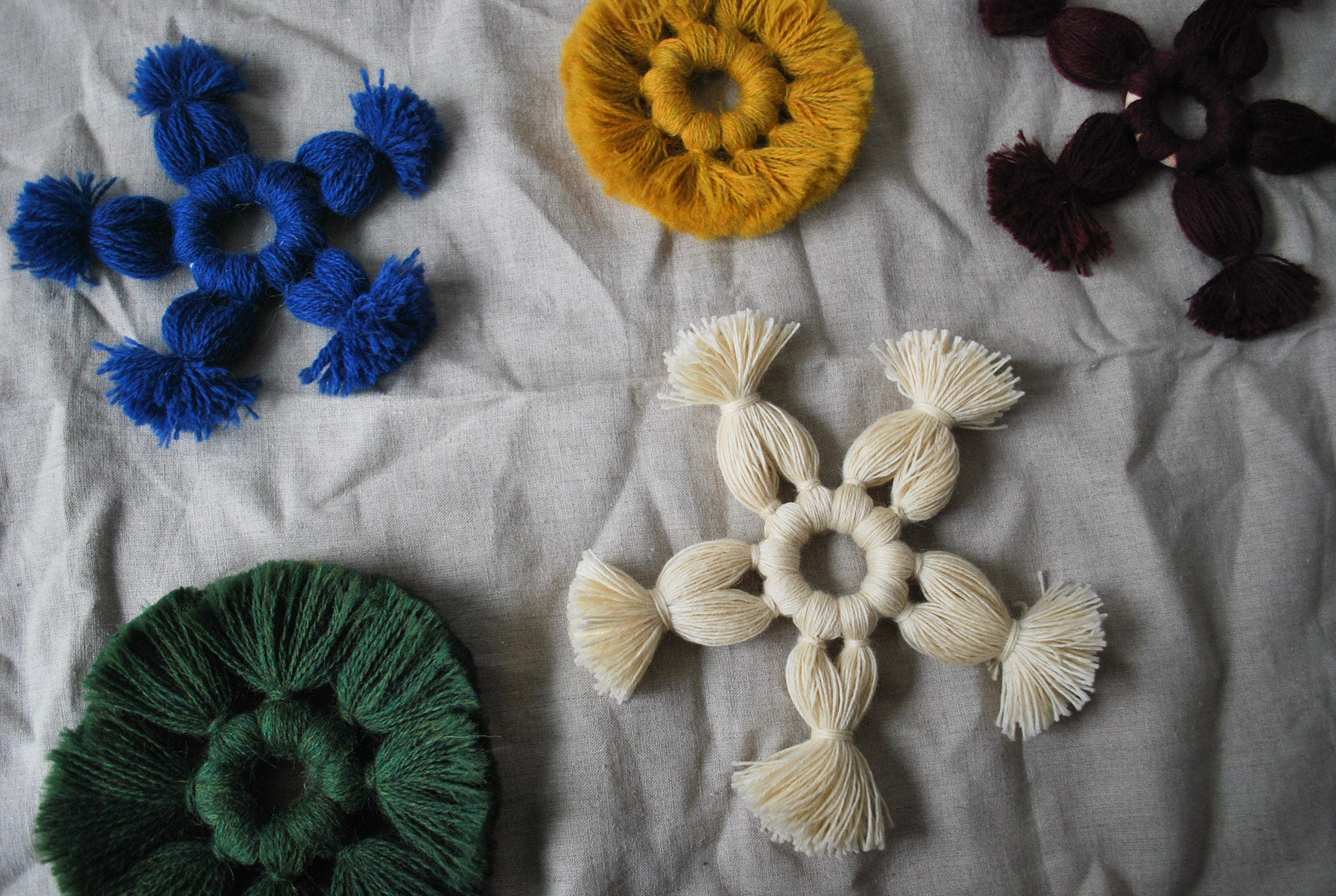 A natural continuation from an obsessive exploration of tassels, these wreath like sun and star charms make the perfect wall or tree decoration to welcome in the winter.